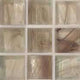 Mosaico di vetro costituito da tessere quadrate, formato 15x15 mm, spessore 6mm (+/- 1), montate su fogli di carta con giunto di ~1,2 mm, per una dimensione totale del foglio di 322x322 mm.